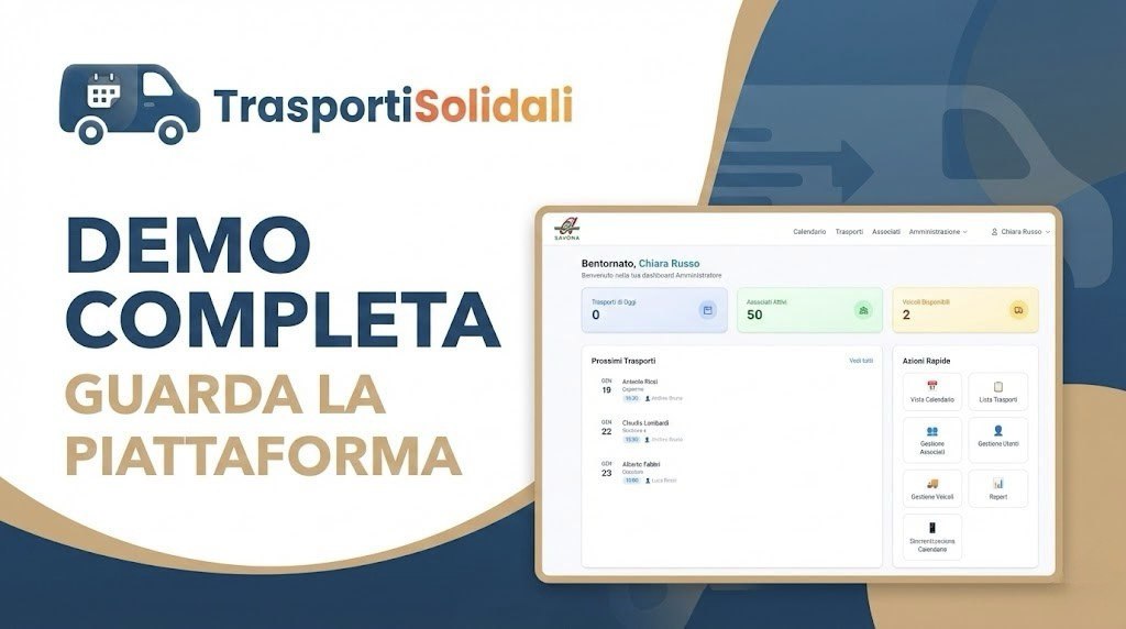 La piattaforma digitale pensata per le associazioni di volontariato che offrono servizi di trasporto. Gestisci appuntamenti, coordina volontari e mezzi, tutto in un unico strumento facile da usare.